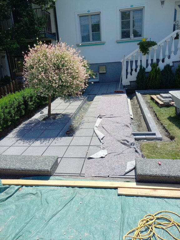 Dieser Vorgarten wird mit Pflasterplatten und Raseneinfassungssteinen erneuert.